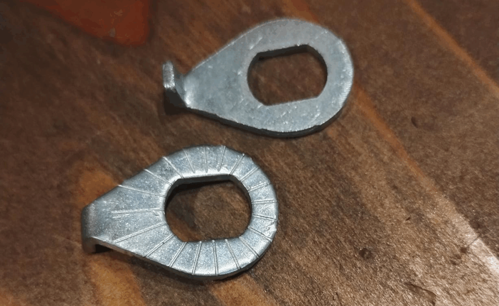 この金具はシティーサイクルに使われる、前輪用の脱輪防止ワッシャーです。