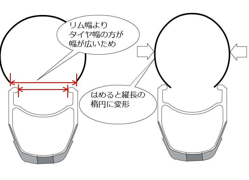 同じタイヤでもリムの幅によってタイヤの膨らみ具合が変わります