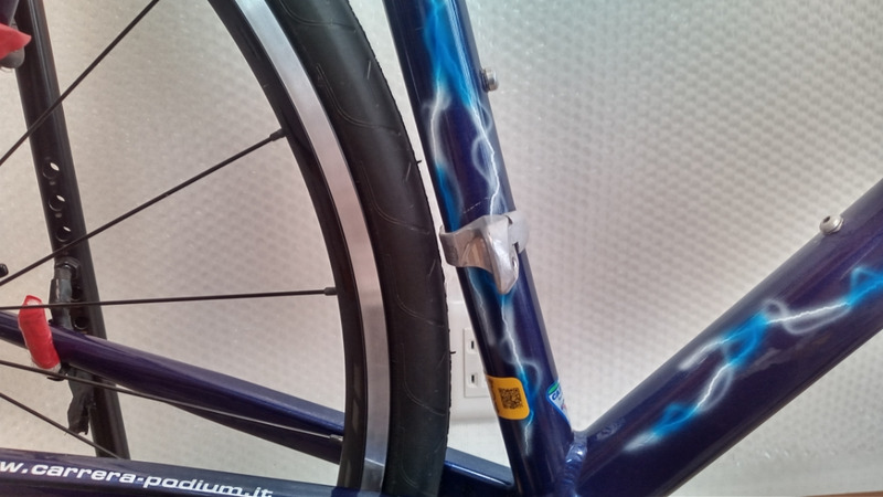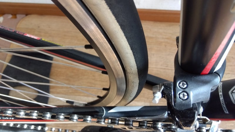 ↑は過去に整備したロードバイクなのですが、25Cの太さでディレイラーバンドとのクリアランスが1㎜くらいしかないフレームもあります。