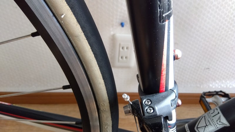 買取したロードバイクで、現在は700×23Cが付いています。