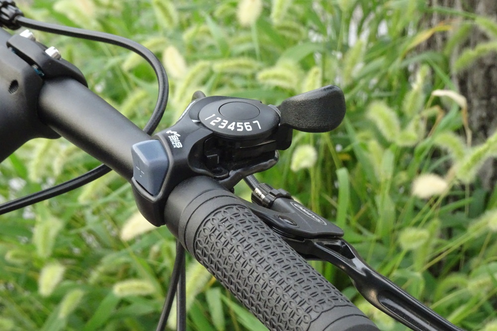 540㎜幅のストレートハンドルにシマノ製の7速サムシフターとテクトロ製のブレーキレバーと丸グリップの組み合わせです。