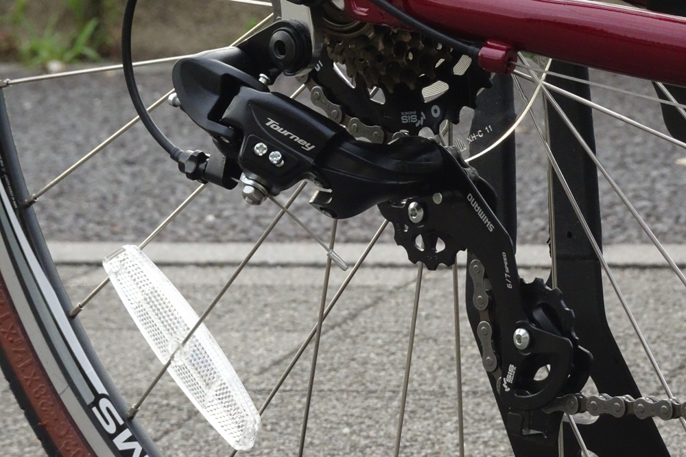 ディレイラーハンガーに6/7速用のシマノ製ターニーのリアディレイラーが付いています。