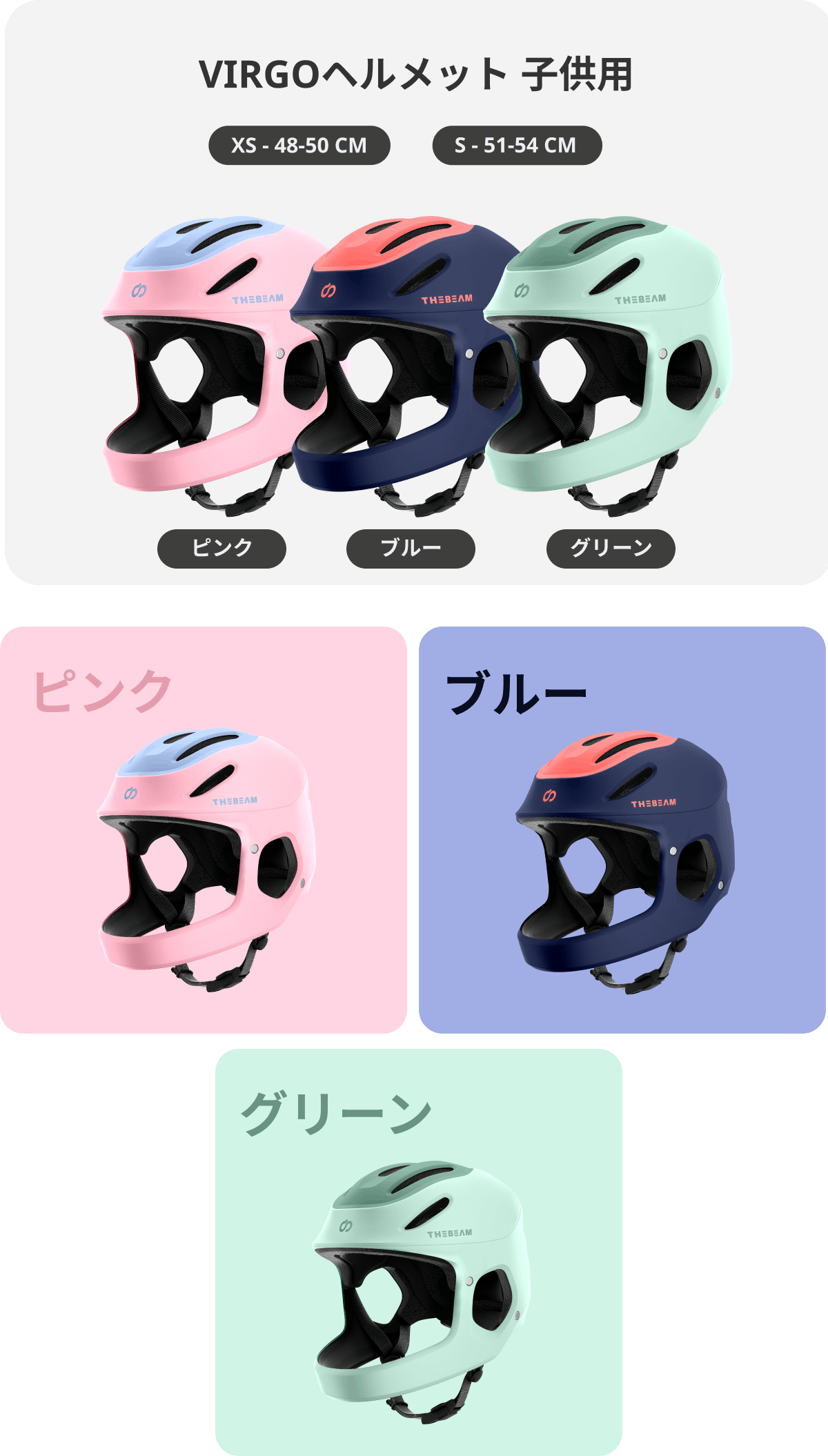 子供用サイズはXS/Sの2展開で、カラーはピンク・ブルー・グリーンの3展開になります。