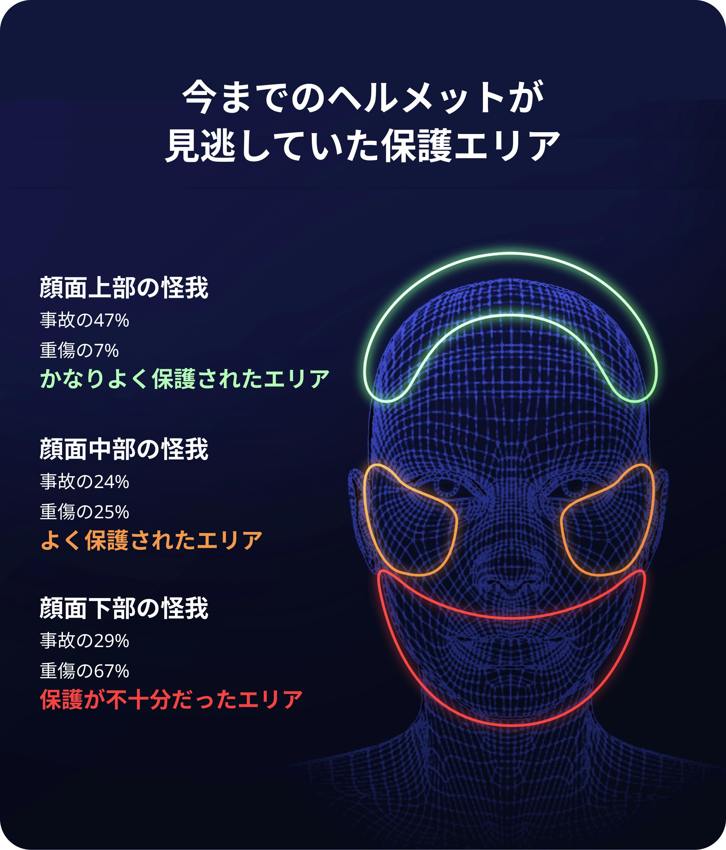 もちろん脳への損傷の軽減が最重要ですが、頬や顎のケガもかなりの割合で起きています。